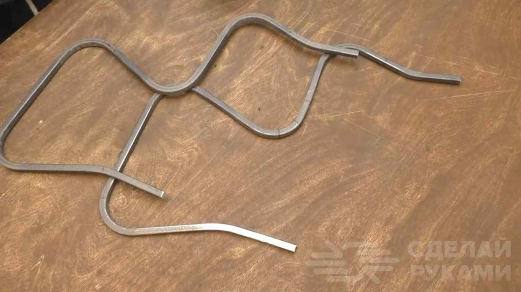 Первым делом мастер отрезает две заготовки из квадратного прутка и придает им необходимую форму на гибочном станке. Соединяем их при помощи двух отрезков квадрата. На одном из них концы делаем круглыми.