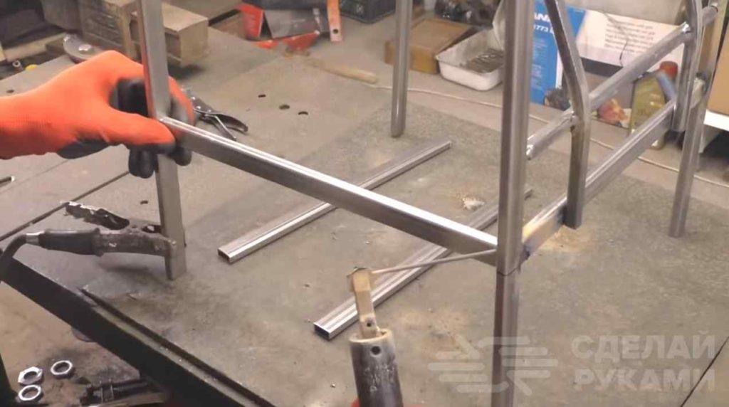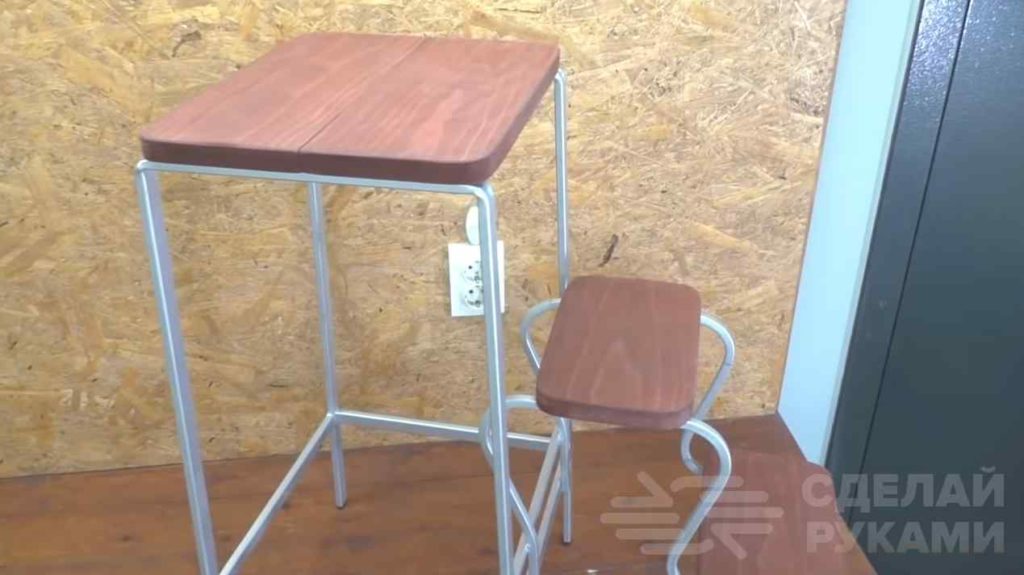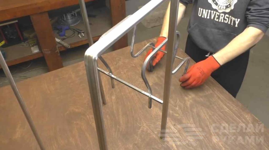 На том гибочном станке из профильной трубы нужно сделать две П-образные ножки. Сверлим в них по одному отверстию и вставляем ранее изготовленную деталь (это будут откидные ступеньки).