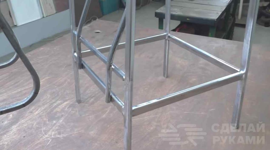 В нижней части ножек стула привариваем отрезки профтрубы для большей жесткости. Сварные швы зачищаем лепестковым кругом для УШМ.
