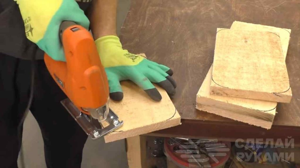 Затем отпиливаем четыре куска доски (подойдет даже сосна) и срезаем углы с помощью электролобзика. У нас получились две ступеньки и сиденье, которое состоит из двух частей.