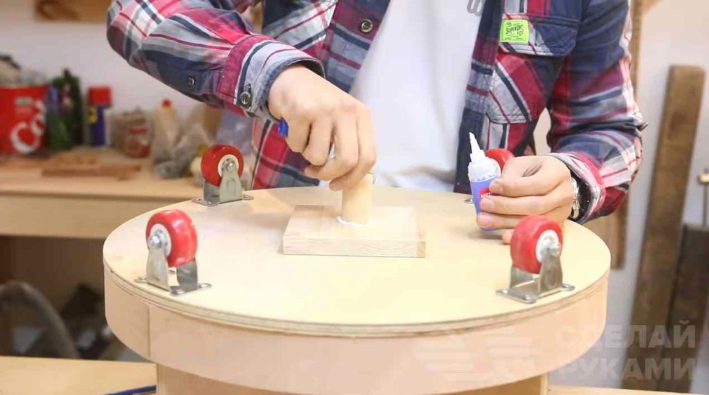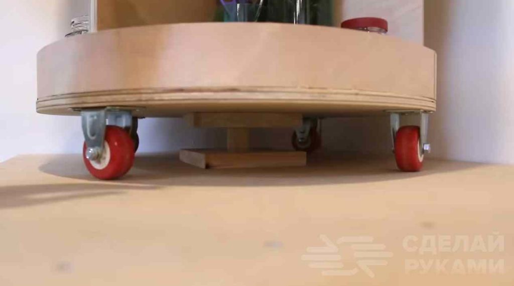 В итоге у нас получилось три яруса — соединяем их друг с другом. После этого к нижней полке (основанию) автор прикручивает мебельные колесики.