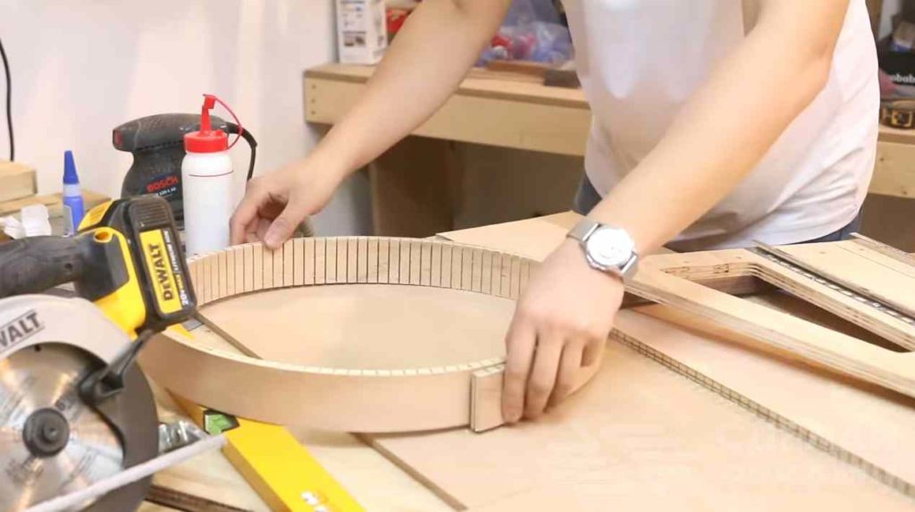 Помимо этого, автор отрезает кусок фанеры нужной ширины и при помощи циркулярной пилы делает поперечные пропилы (примерно на 2/3 толщины).