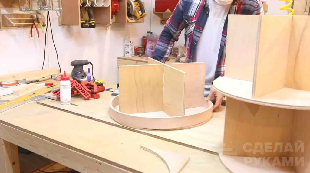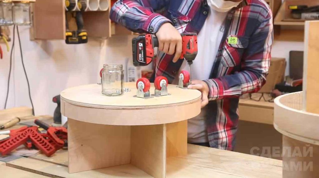 Подробно о том, как сделать своими руками вращающуюся подставку из фанеры для домашней мастерской, можно посмотреть на видео. Пишите в комментариях свое мнение о данной самоделке.