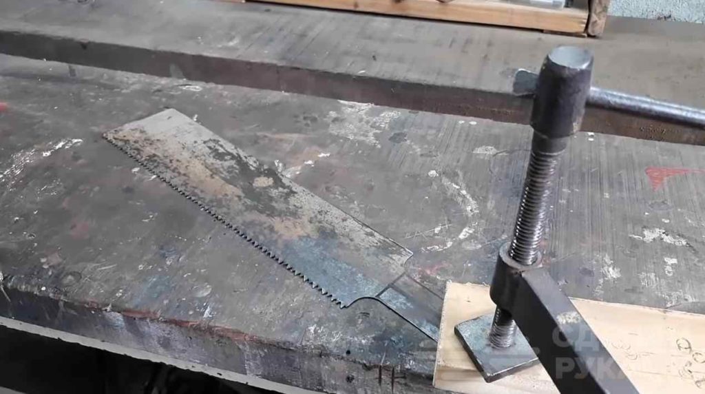Первым делом необходимо снять с ручной пилы ручку (она может быть деревянной или пластмассовой). Затем автор делает разметку, и при помощи болгарки вырезает форму японской ножовки.