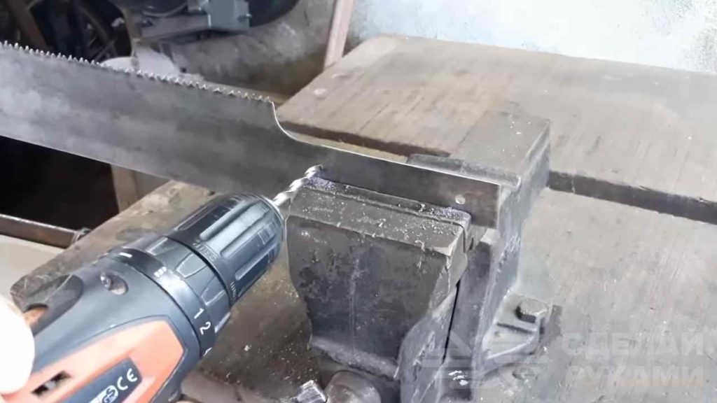 В хвостовой части пильного полотна автор сверлит два отверстия, которые нужны для крепления ручки.
