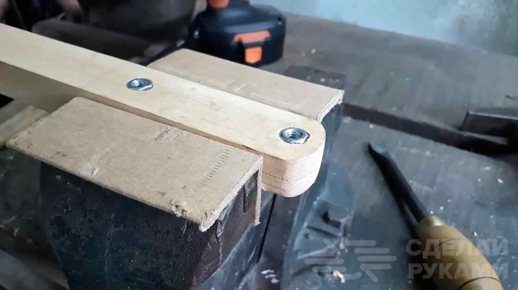 Нужно отпилить брусок подходящей длины (желательно из древесины твердых пород) и просверлить в нем два отверстия. С одной стороны бруска автор запрессовывает две гайки.