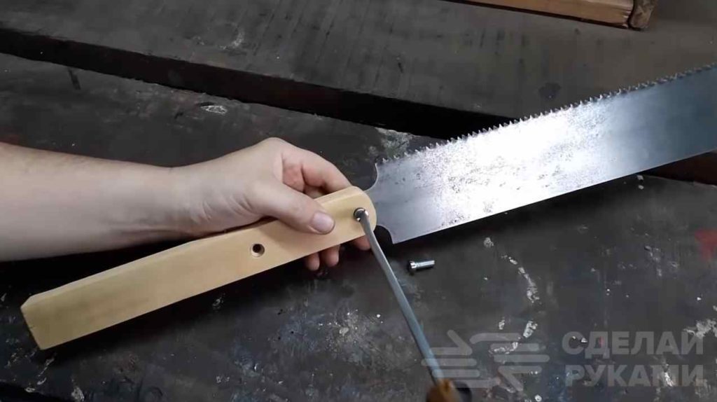 Фиксируем ножовку с помощью двух болтов. Предварительно их надо обработать, чтобы шляпки были заподлицо с поверхностью ручки. По центру каждой шляпки автор делает прорезь, чтобы можно было закручивать болты отверткой.