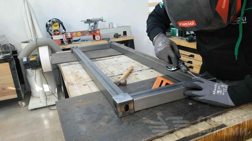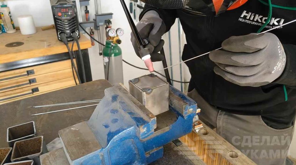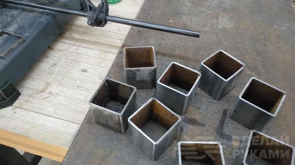 Для начала изготовим торцевые заглушки углов. Для этого отрезаем необходимые кусочки квадратной профтрубы и завариваем их по форме куба.