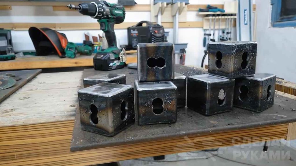 На двух боковых стенках сверлим отверстия и добиваемся овальной формы напильником. После этого привариваем кубики на края трубы и соединяем между собой четыре трубы, формируя крышку. То же самое делаем ещё с четырьмя трубами.