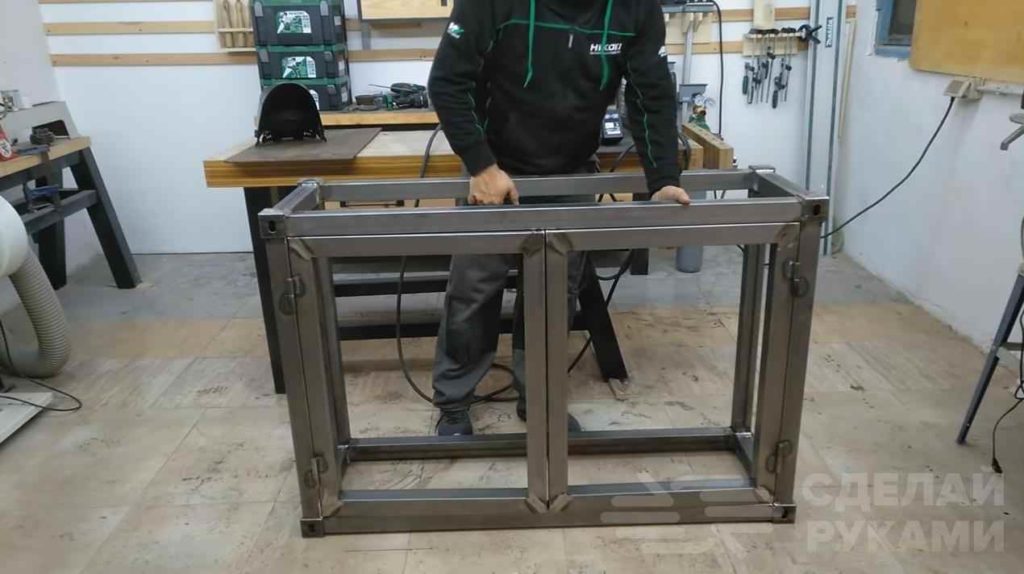 Отрезаем подходящего размера несколько заготовок и свариваем их под углом 45 градусов между собой. Устанавливаем их на будущую переднюю стенку и привариваем петли.