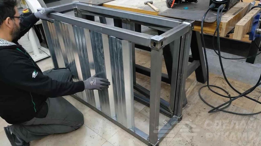 Боковые стенки будем изготавливать из профильного листа. Вырезаем каждую стенку и прихватываем на сварку в местах жесткости листов. Верхнюю крышку сделаем из листового металла.
