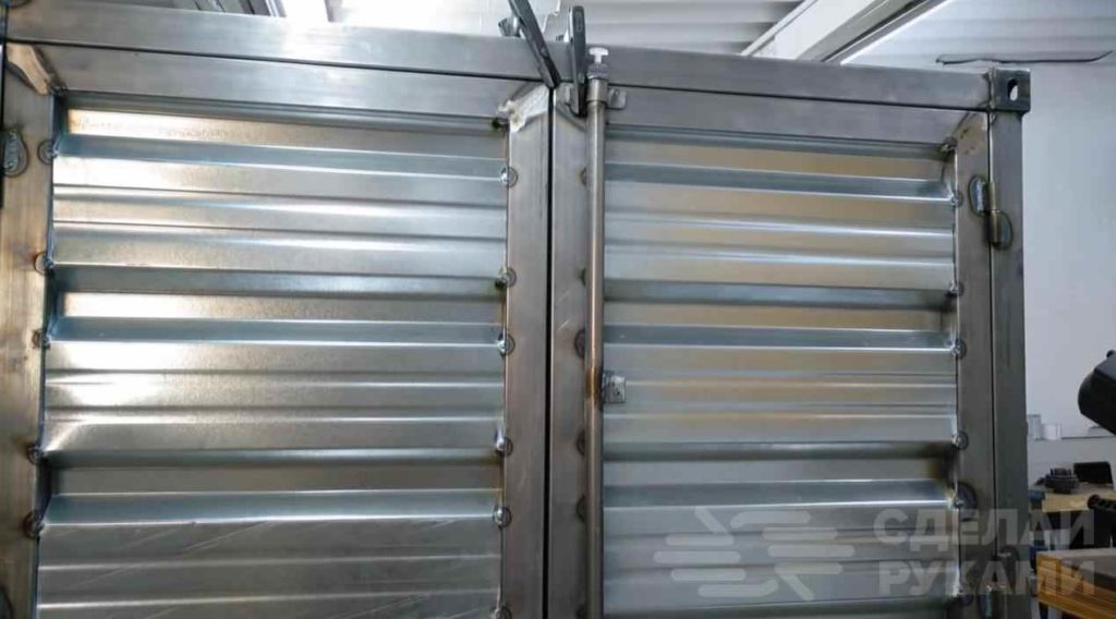 Соединяем их вместе, согласно чертежу, и проверяем работоспособность закрывания и открывания всего механизма. На вторую дверку, с обратной стороны, привариваем пластину металла (это будет ограничитель).