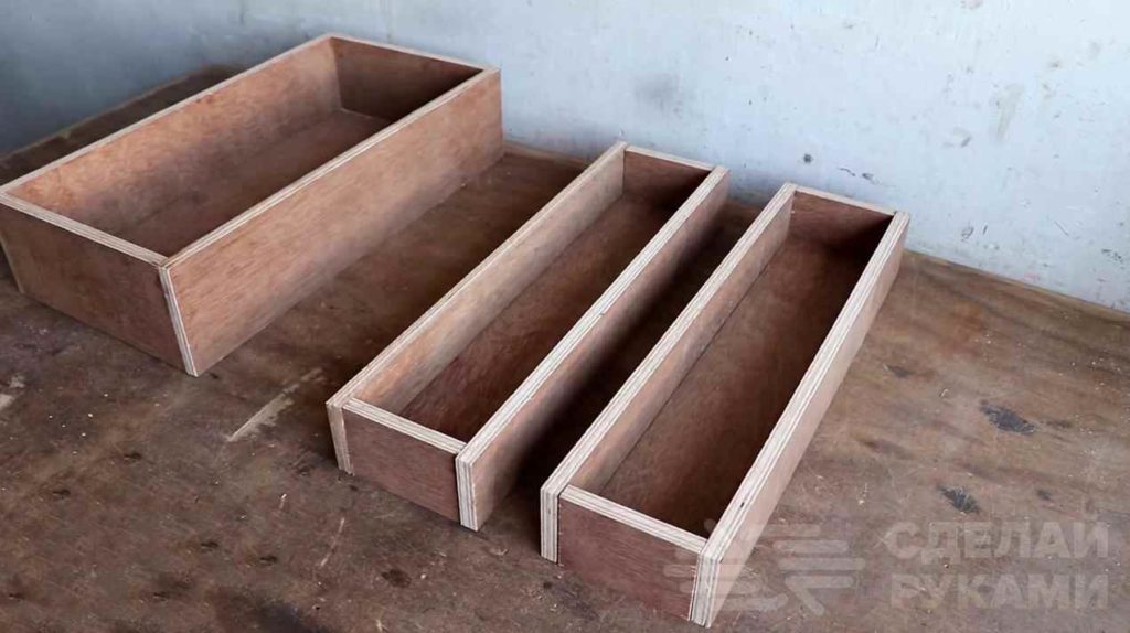Распиливаем лист фанеры на заготовки подходящего размера. Затем собираем из них три короба. Широкий короб будет находиться снизу, два узких — сверху.