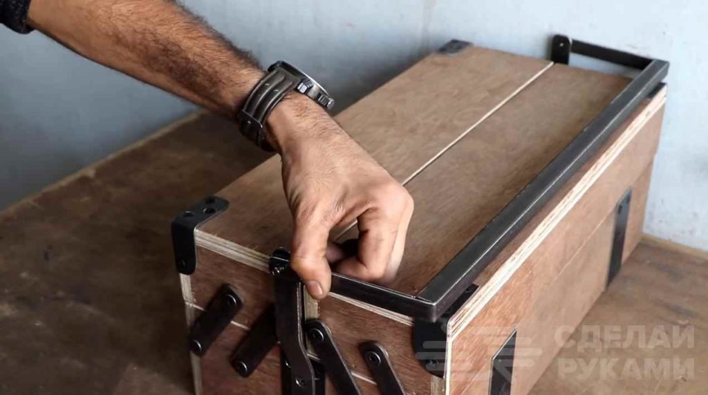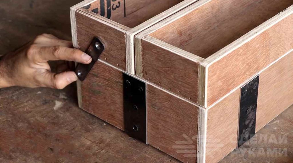 Основной материал для изготовления ящика — фанера. Также потребуются металлические уголки и пластины. Отрезаем детали по размеру и сверлим в них отверстия.